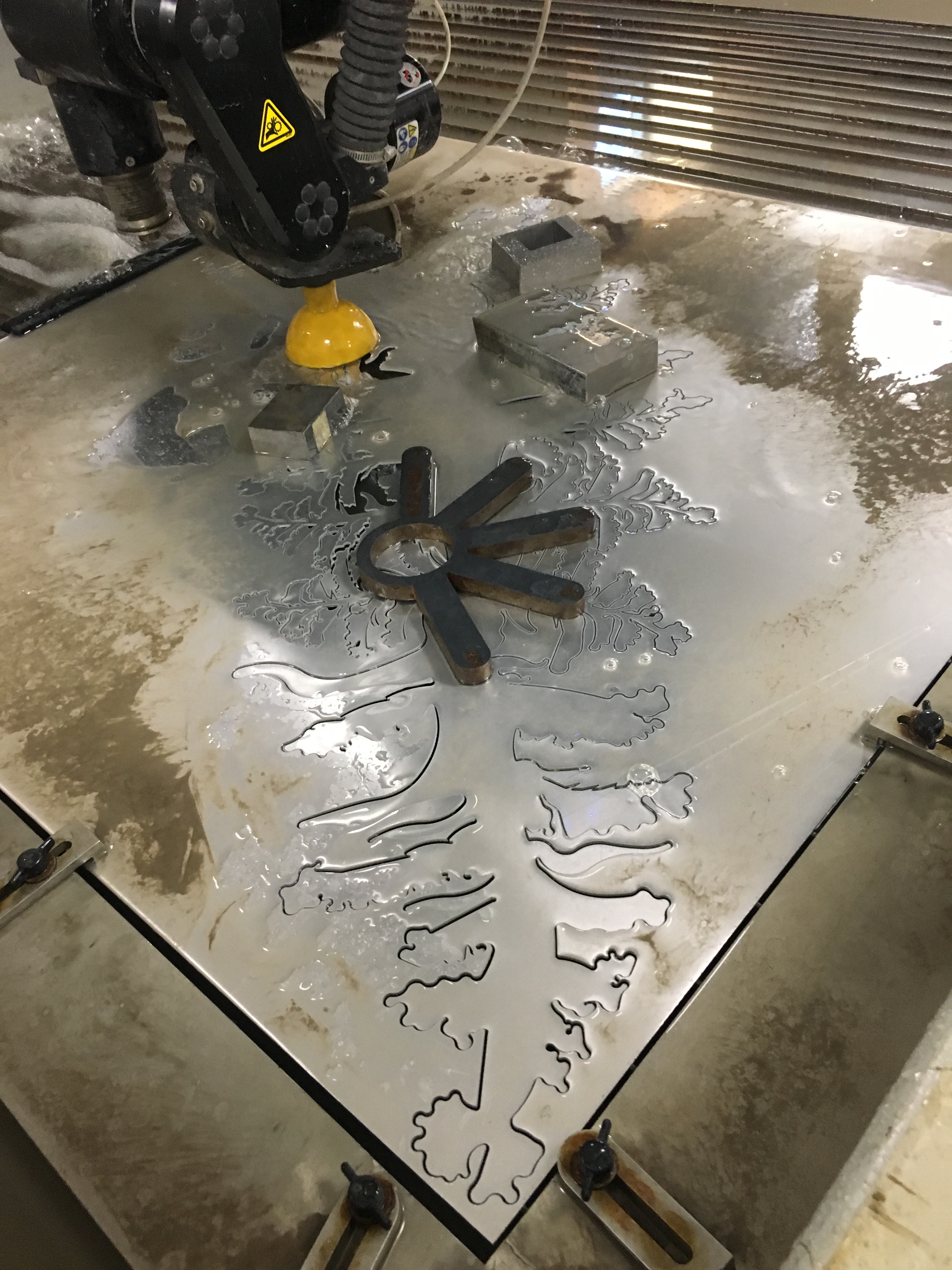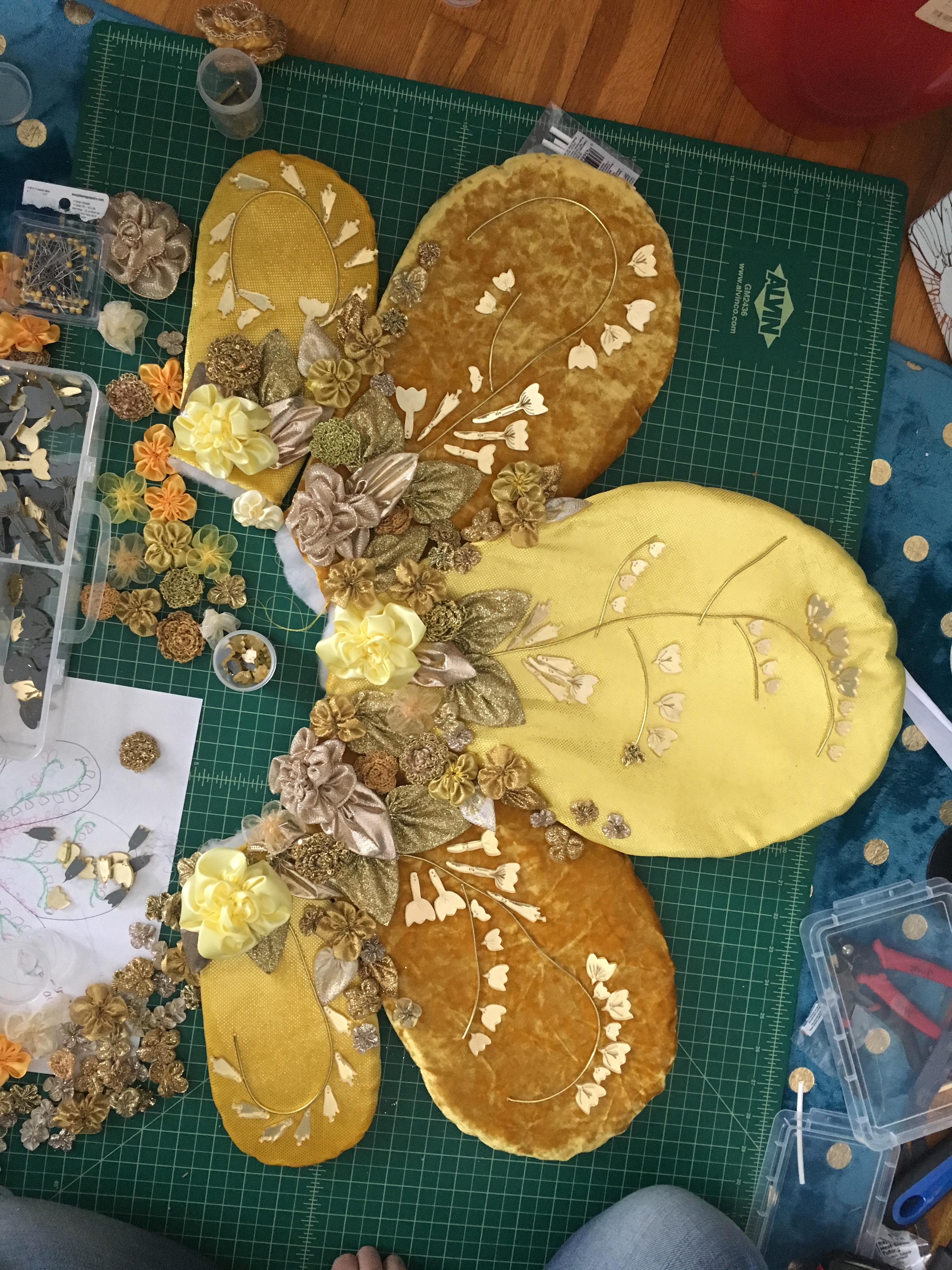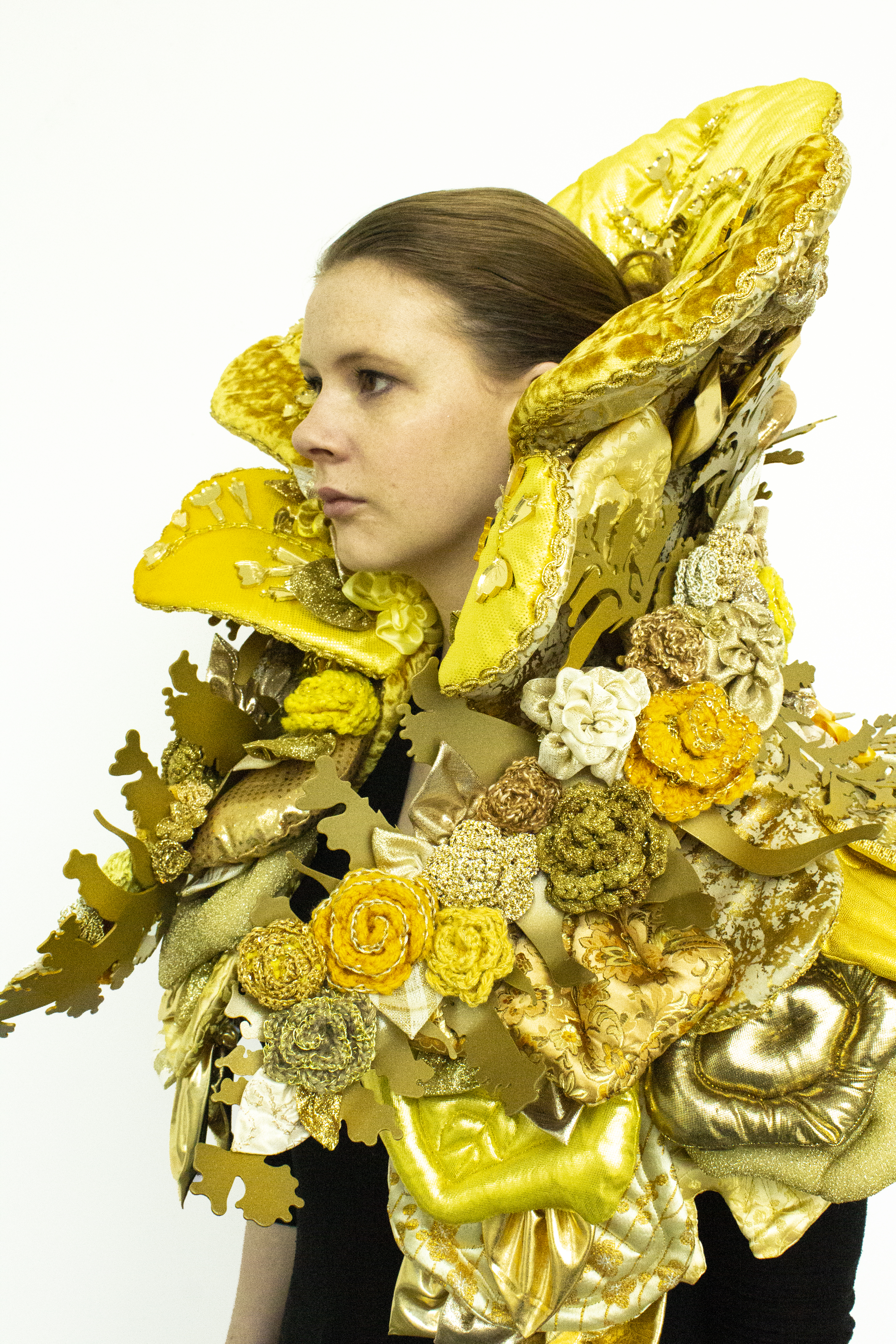 Untitled Collaboration between Jen Ramirez and Rachel Smith. Waterjet cut aluminum, powder coat, crochet, quilting, ribbon flowers, embroidery, laser cut acrylic. 2019.