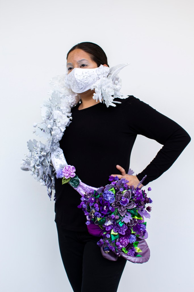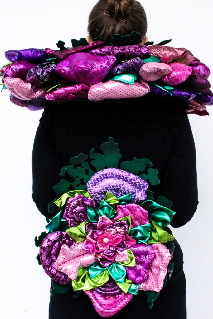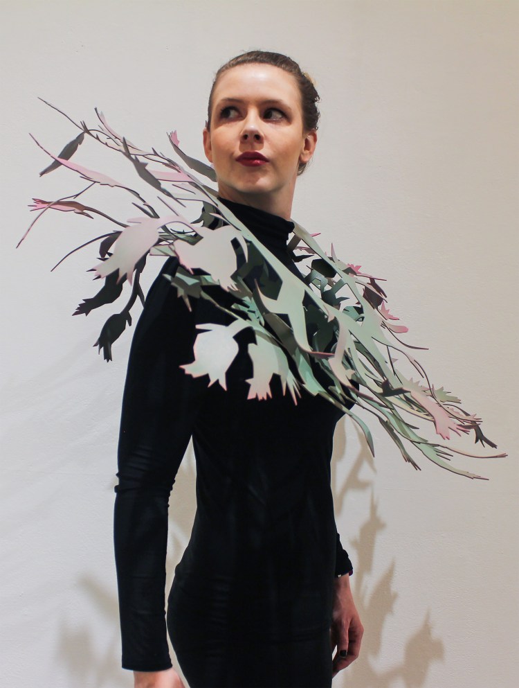 This piece was created for the 2018 Society of North American Goldsmith Exhibition in Motion event. Smith designed the aluminum structure using imagery of carnivorous plants that adorned points of weakness on the body. The harsh metal armor was padded with lush sewn flowers and quilted petals.