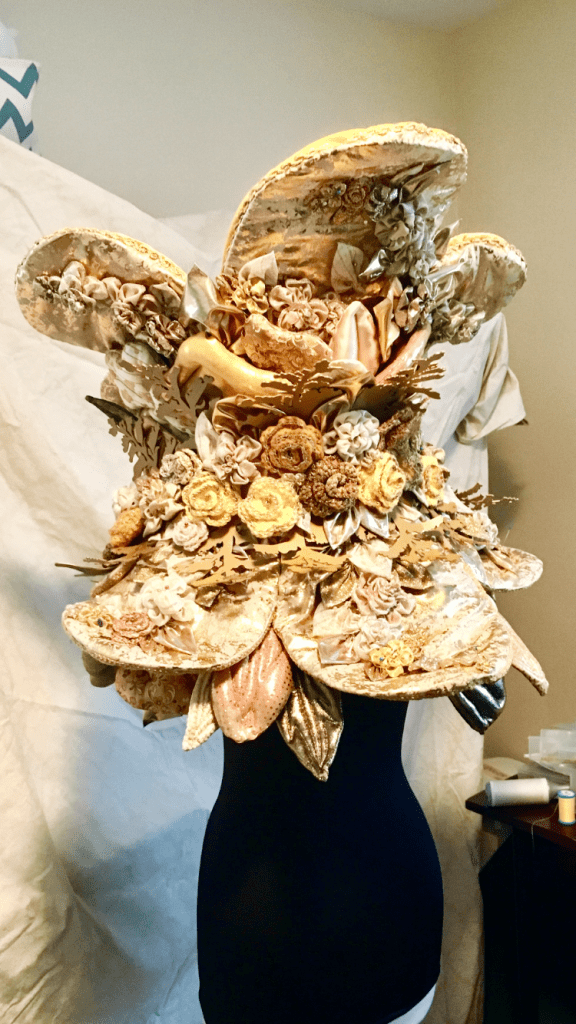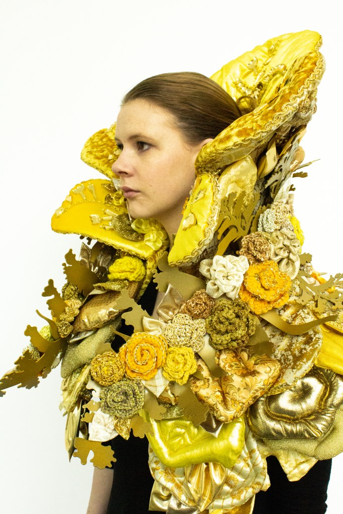 This piece was created for the 2019 Society of North American Goldsmith Exhibition in Motion event. Smith designed the aluminum structure around tracings of dried goldenrod specimens. Goldenrod flowers are critical in the support of monarch butterflies in the fall months. Monarchs are migratory pollinators in serious need of support right now. Goldenrod is also often mistaken for ragweed, or considered an eyesore. We created an opulent and over-the-top piece in celebration of the plant to shift the narrative and deem it as valuable.