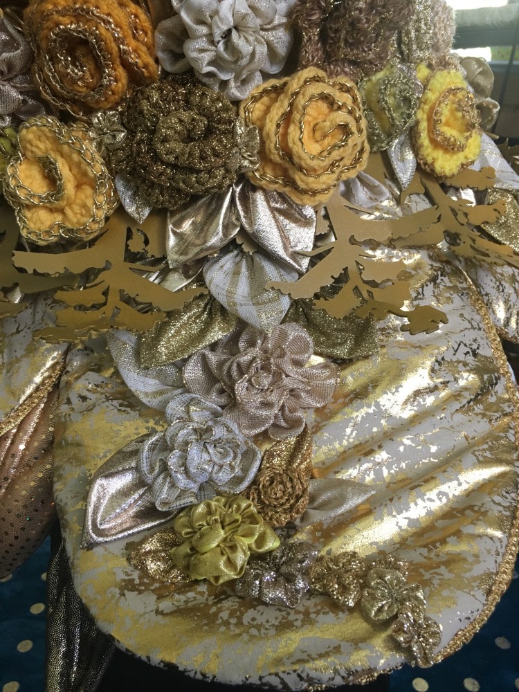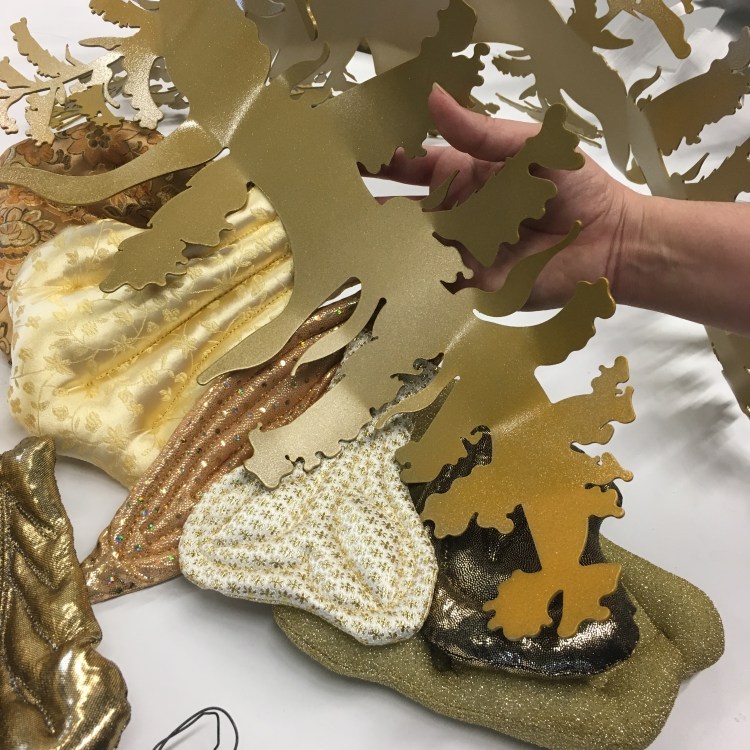 Goldenrod. A collaborative project by Jennifer Ramirez and Rachel Suzanne Smith. Waterjet cut aluminum, powder coat, laser cutting, crochet, ribbon, fabric, batting.