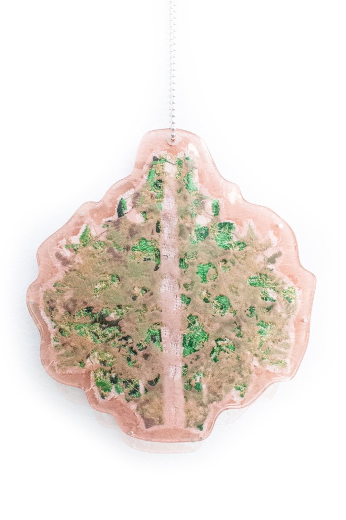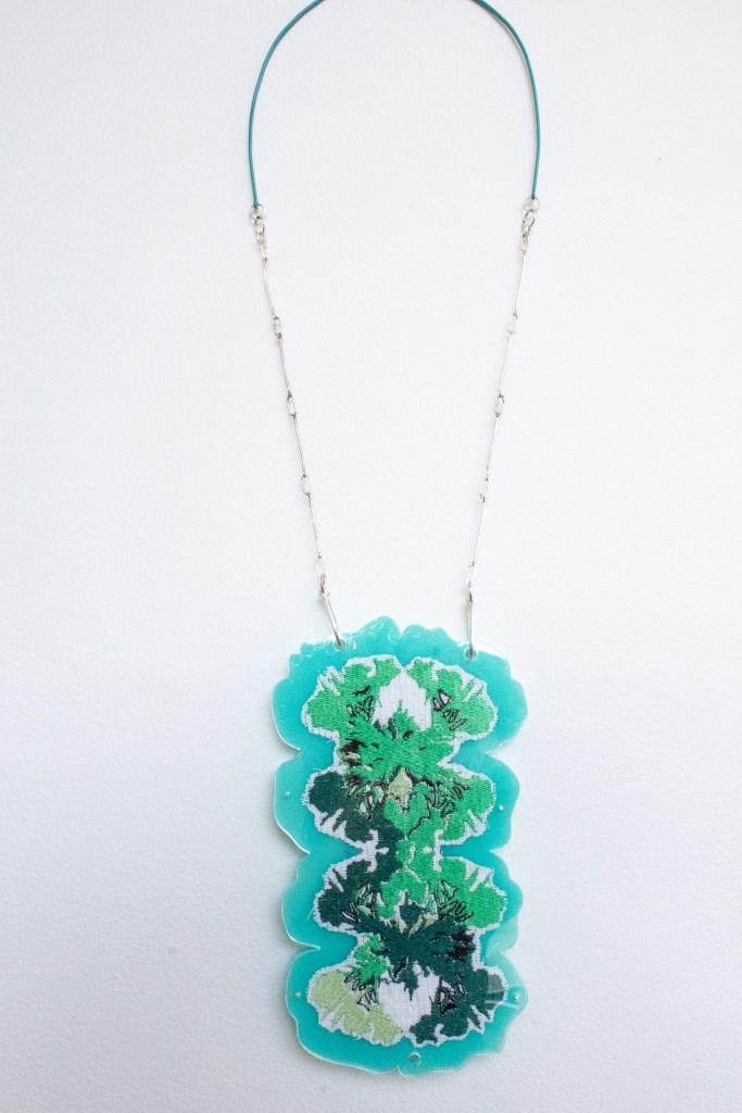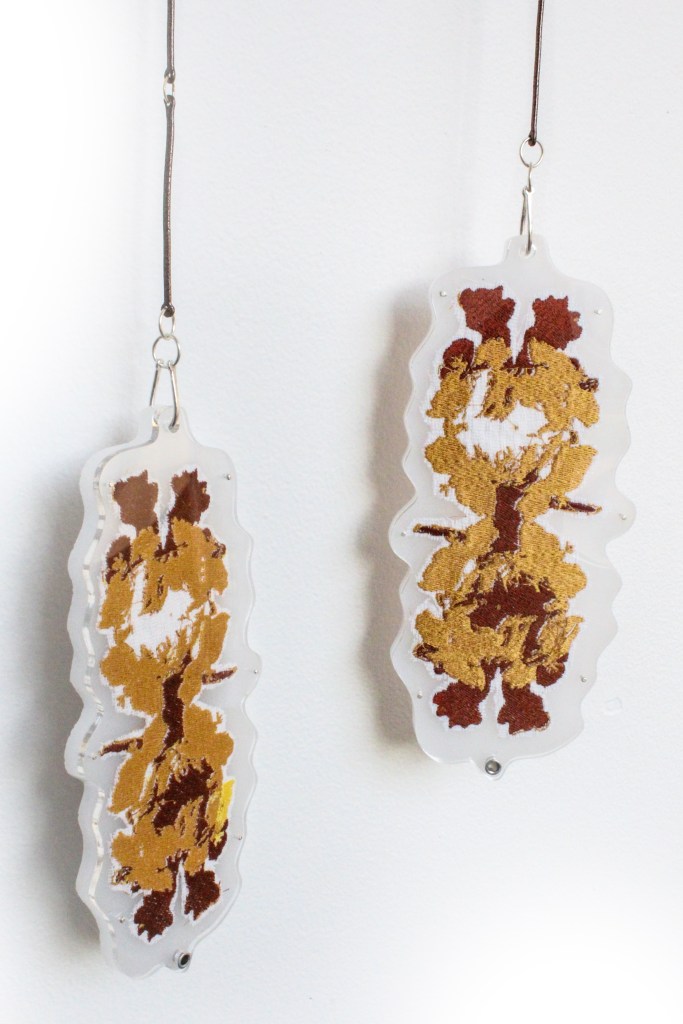 These works were also inspired by Victorian Wallpaper and the decorative arts era. I used photography and sketches of mosses and flowers to create my digitized designs for embroidery. The backs and sometimes fronts of each laser-cut acrylic piece was etched with up-close photographic imagery from the forest floor.