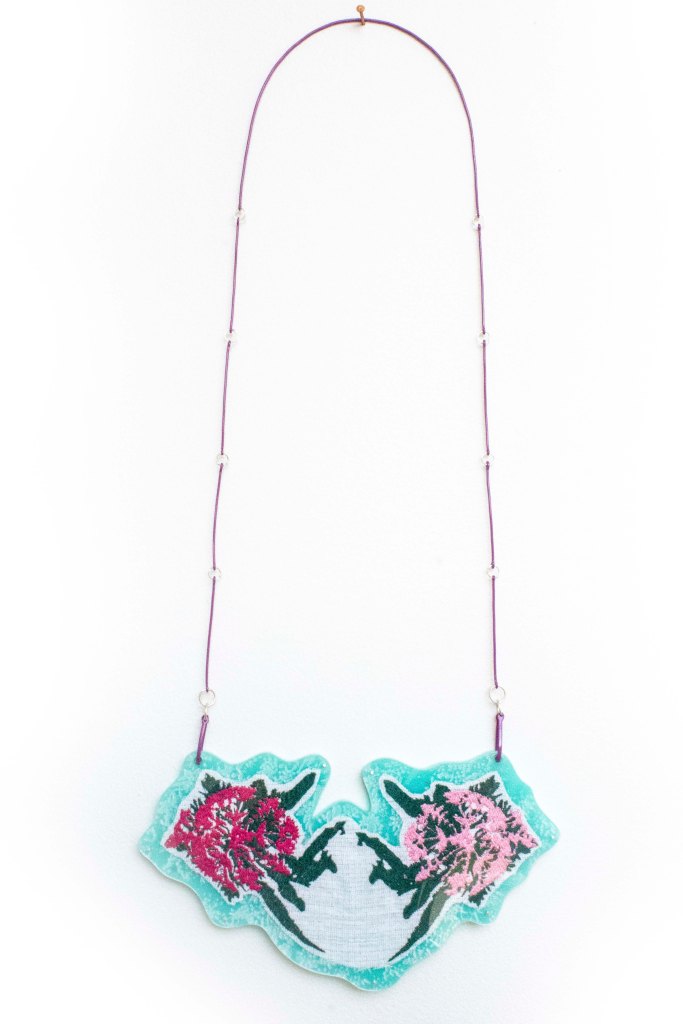 Pollinate. A collaborative project by Jennifer Ramirez and Rachel Suzanne Smith. Waterjet cut aluminum, powder coat, digital embroidery, ribbon, fabric, batting.