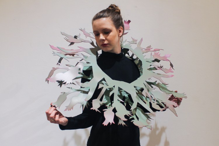 Inspired by Victorian wallpaper and historical decorative design/ the decorative arts, I created a wallpaper of brooches that can be taken off and worn as desired. Each piece is designed in Rhino, waterjet cut, formed, powder-coated, riveted, and attached with a handmade pinback. When worn, the proximity to the wall allows the wearer to blend in or stand out, depending on personal placement. I wanted to create a piece that would allow the wearer to sink into an opulent surrounding area, or stand out in a more casual setting.