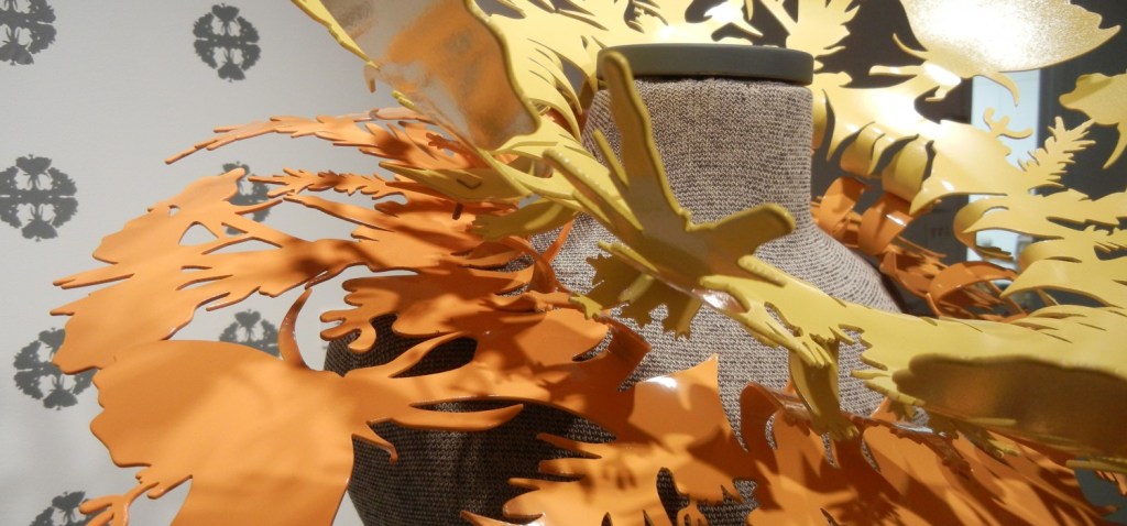 The show’s title What I Lived For is an appropriated portion of a chapter title in Henry David Thoreau’s Walden. It is in this chapter that Thoreau proclaims “ I went to the woods because I wished to live deliberately, to front only the essential facts of life, and see if I could not learn what it had to teach, and not, when I came to die, discover that I had not lived” (p. 56). This famous statement is quoted often, as it captures the yearning to connect to nature that so many people express. The quote’s popularity becomes ironic, as such desires are not typically acted upon; it is often the sentiment behind the idea or the projection of this yearning that fills a person’s need. The title therefore underlines the irony of what is otherwise a body of beautiful, oversized art jewelry pieces. It is not always practical to venture out into the woods, as one typically finds that a true encounter with nature can be uncomfortable, nor would the wearer of this work ever choose to adventure into those woods while donning any of these statement pieces. Instead it is the construction of a person’s identity that is transmitted in each piece, full of valid importance yet void of practical application.